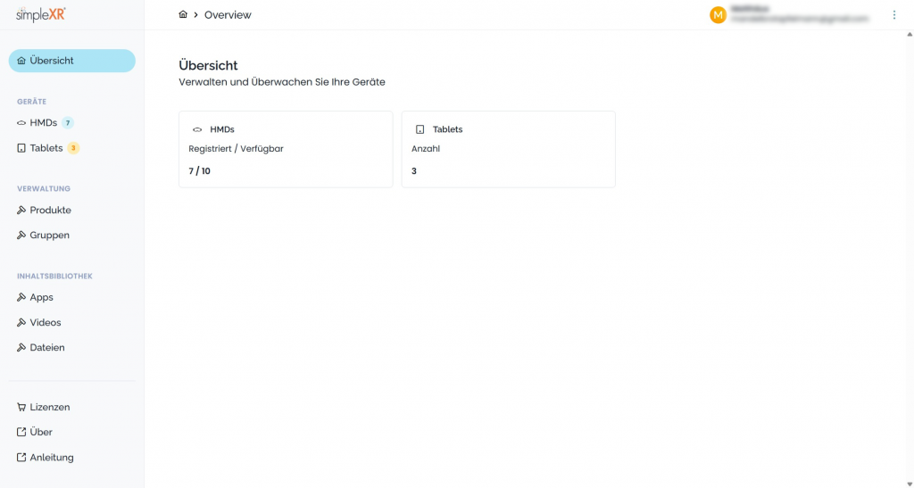 simpleXR befindet sich in der Weiterentwicklung. Im Moment beschränken sich die Funktionen auf den Kauf von Lizenzen, die Registrierung von HMDs und Tablets und die Nutzung von simpleXR Remote.