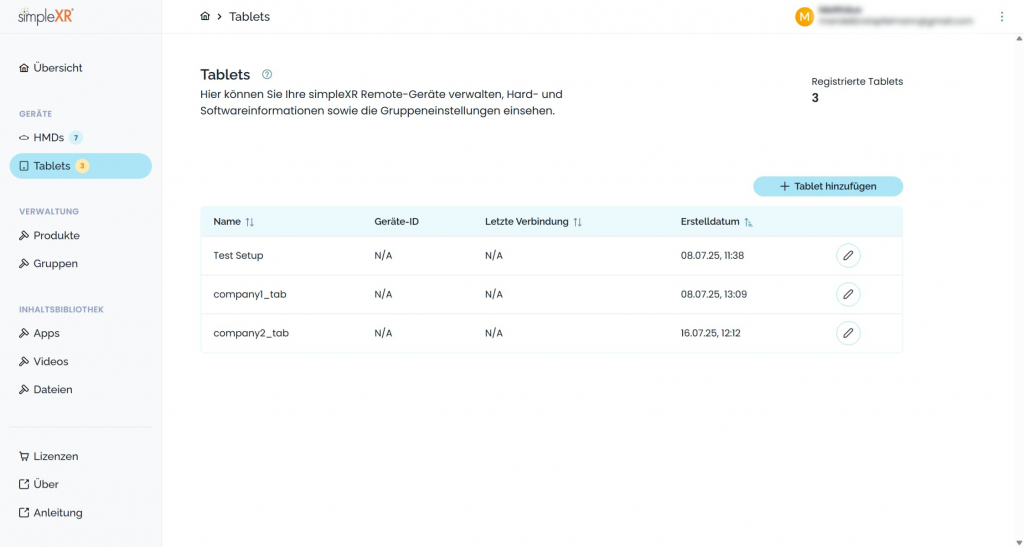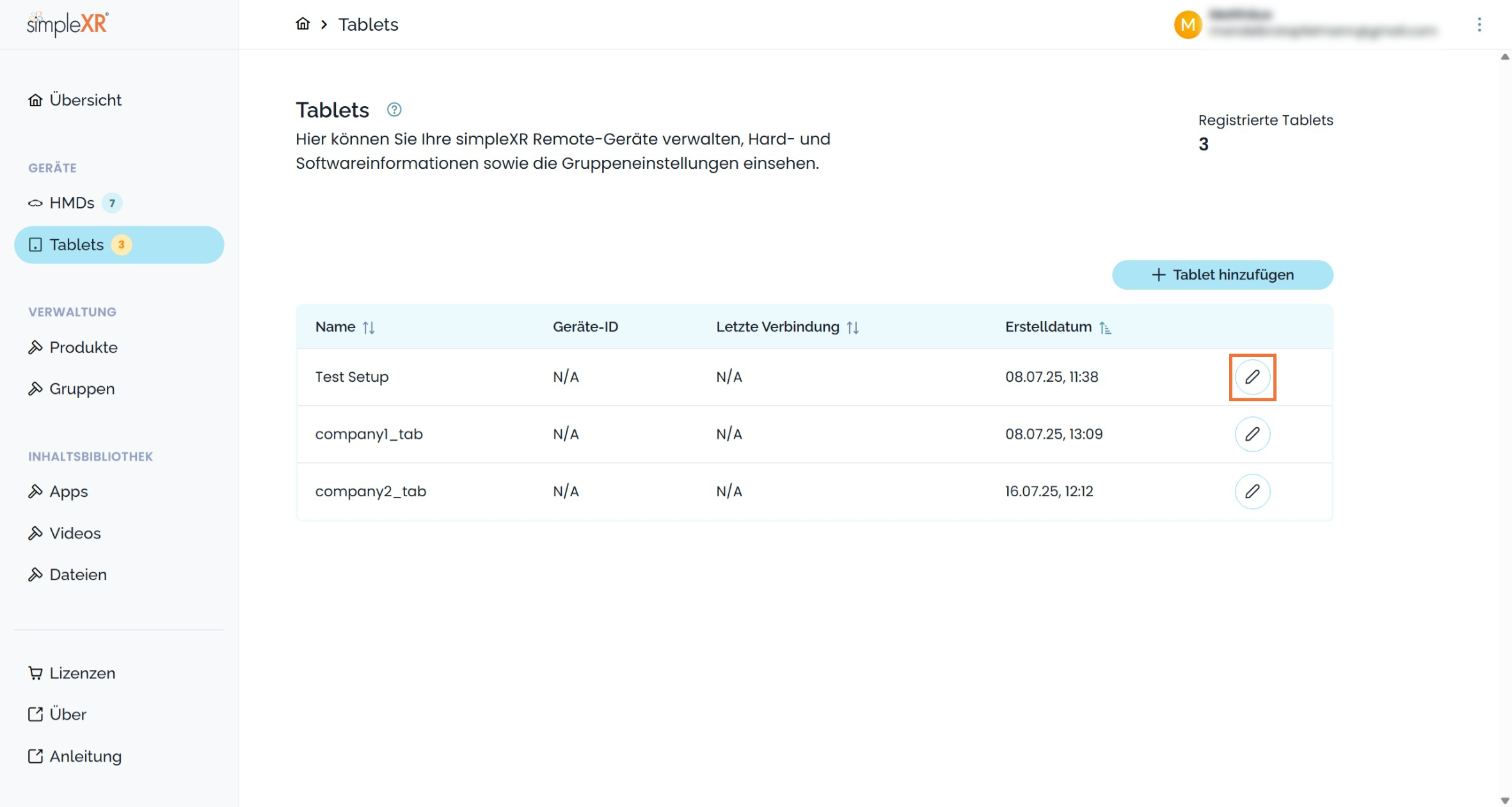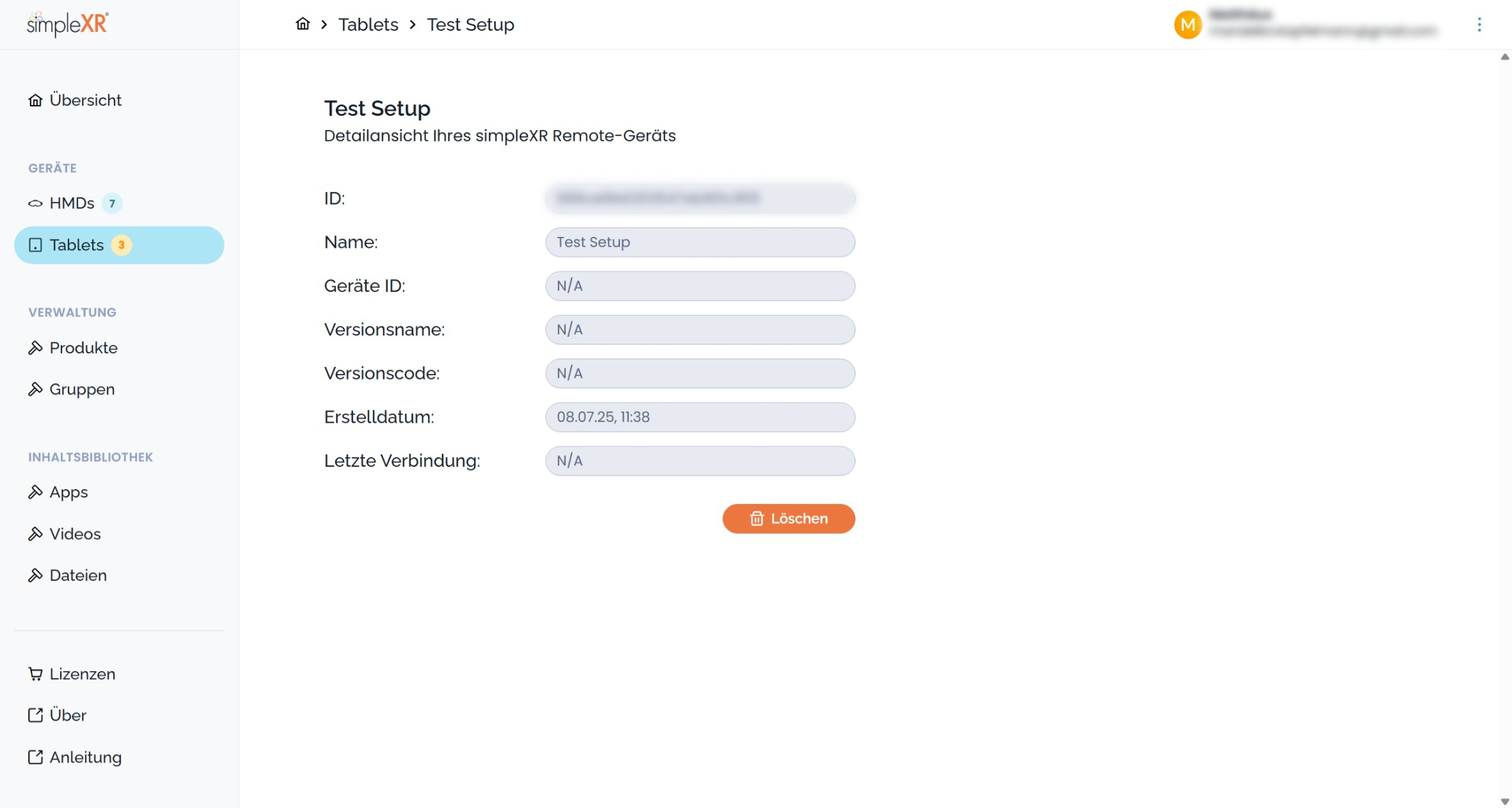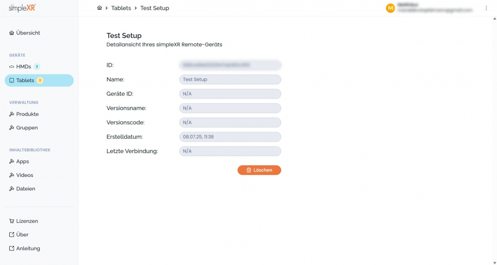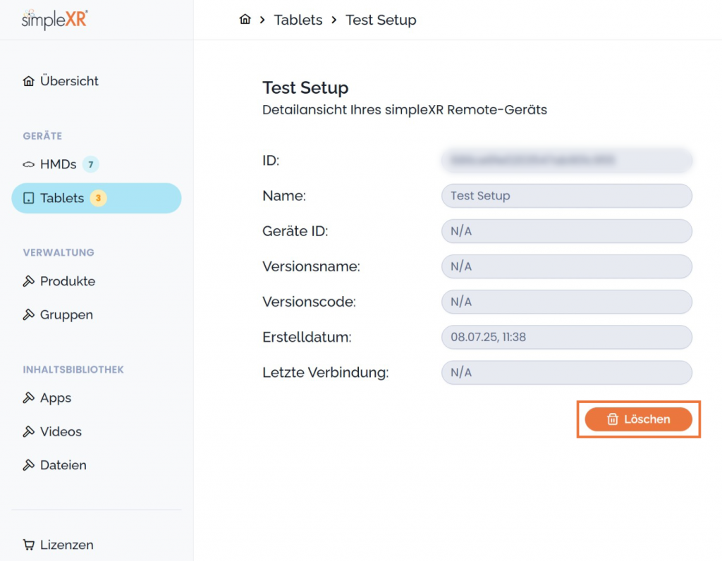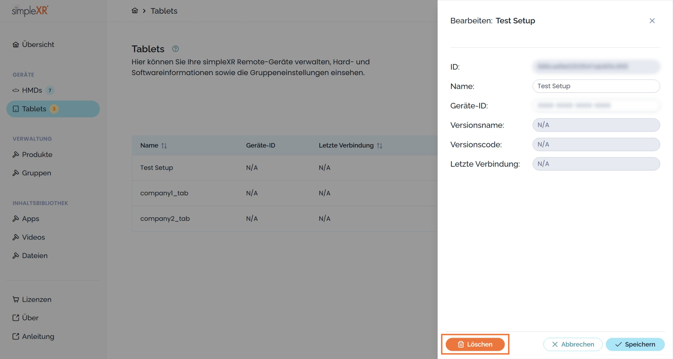 Sie können ein Tablet aus simpleXR entfernen, indem Sie die Schaltfläche „Löschen“ auf der Detailseite des Tablets oder im Bearbeiten-Bereich anklicken.