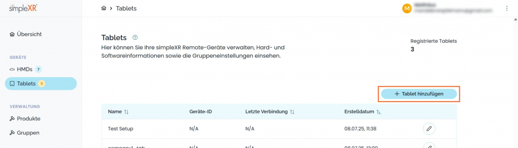 Um neue Tablets hinzuzufügen, klicken Sie auf die Schaltfläche Tablet hinzufügen in der oberen rechten Ecke. Daraufhin wird ein Dialog geöffnet, der Sie durch den Vorgang führt.